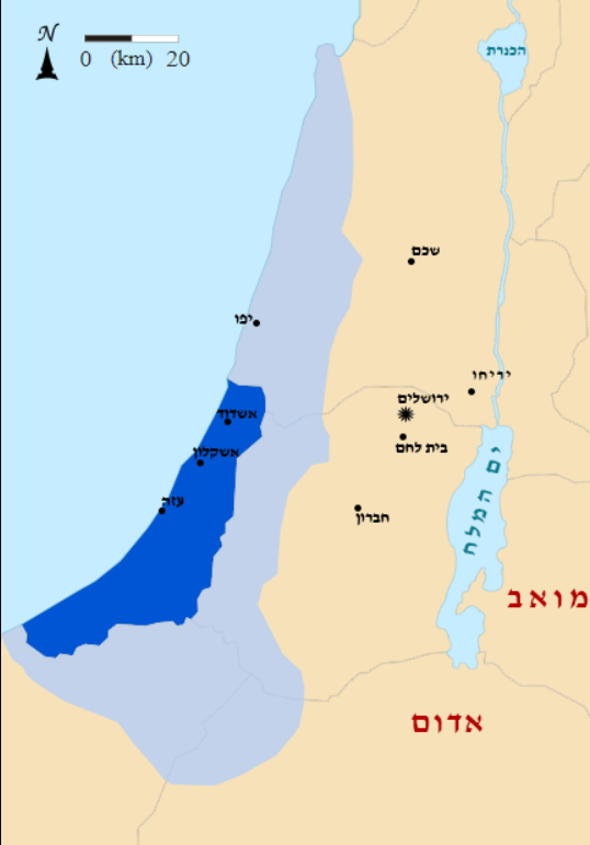 The term “Palestine” historically has referred to the land roughly north of Egypt and south of Syria. The Biblical origin of the name is פלשת or ארץ פלשתים , the Land of the Philistines. The Philistines were an ancient, originally seafaring people who settled on the southern Mediterranean coast of the Land of Canaan. Gaza, Ashkelon, Ashdod, Gat, Mikne, Ekron, were some of the main Philistine cities. Even though borders changed throughout the ages, and Philistine influence went far beyond, the Land of Philistines was the coastal plain, about 75 kms. long, from the Besor River to the south (spills into the sea at Gaza Strip), to the port city of Yafo to the north, bordered to the east by the Judean Lowlands and and Ephraim hills about 25 kms. to the east of the coast line. Not to be confused with the parts of the west bank, located far to the east, up on the ridges and on the eastern flanks of the Judean and Samarian hills, administered by the Palestinian Authority!