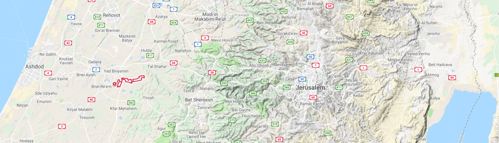 See the route, marked in red, at the transition between the coastal plain to the west and the Judean lowlands to the east.